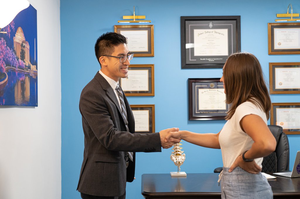 Prior to coming in, please ensure that the office has your insurance information and you have filled out all of the new patient forms online. Otherwise, you can elect to fill out the paperwork in the lobby once you come in. If you have not received any paperwork via email or have insurance questions, you can give our office a call at 202-599-9069. Please bring any prior imaging reports (X-rays, MRIs, lab results) and pertinent doctor reports from previous chiropractors or treating facilities. This may include your primary care doctor’s reports, your lab reports, or a list of your medications. Our goal is to deliver the most comprehensive care and get the best overall understanding of your entire history.